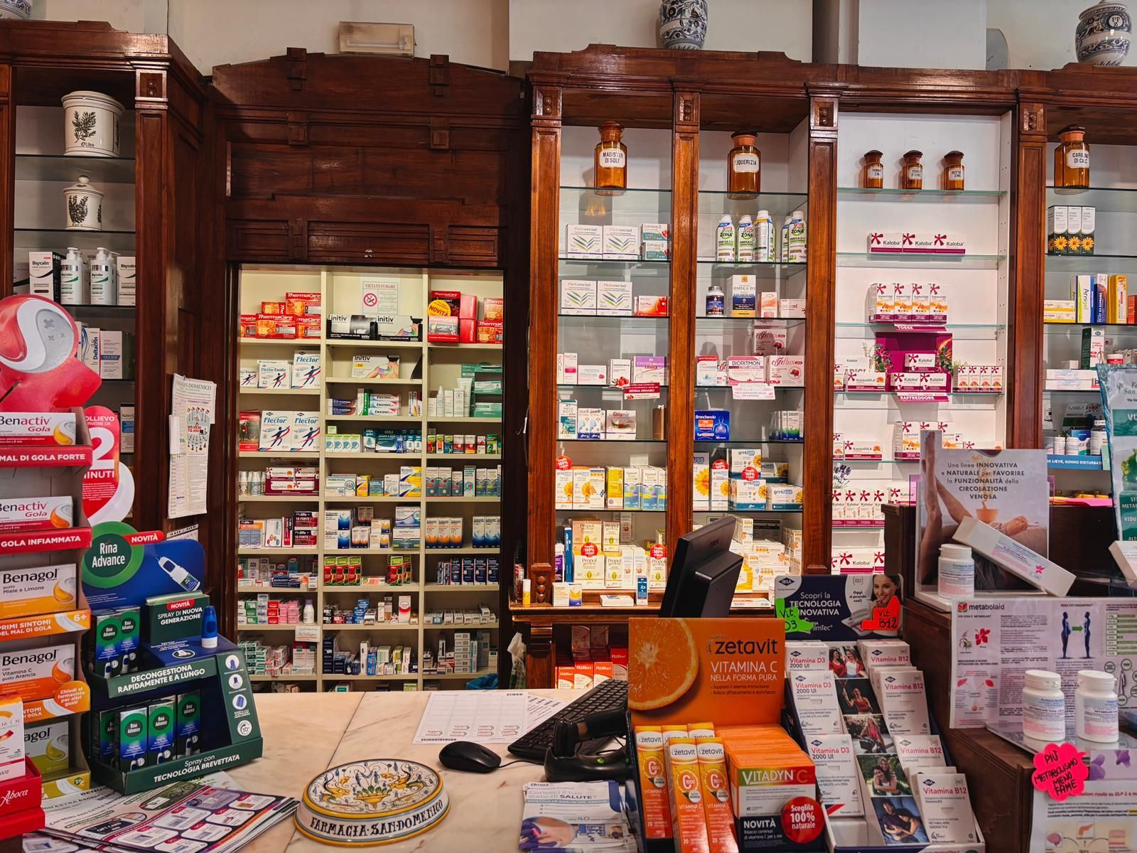 In questo magnifico contesto si inserisce la storica Farmacia San Domenico, quivi dislocata dai primi del '900. Gli interni e gli storici arredi originali dei primi anni del secolo scorso, rinnovati nel 2012, sono stati conservati e anzi attentamente restaurati e valorizzatati.
